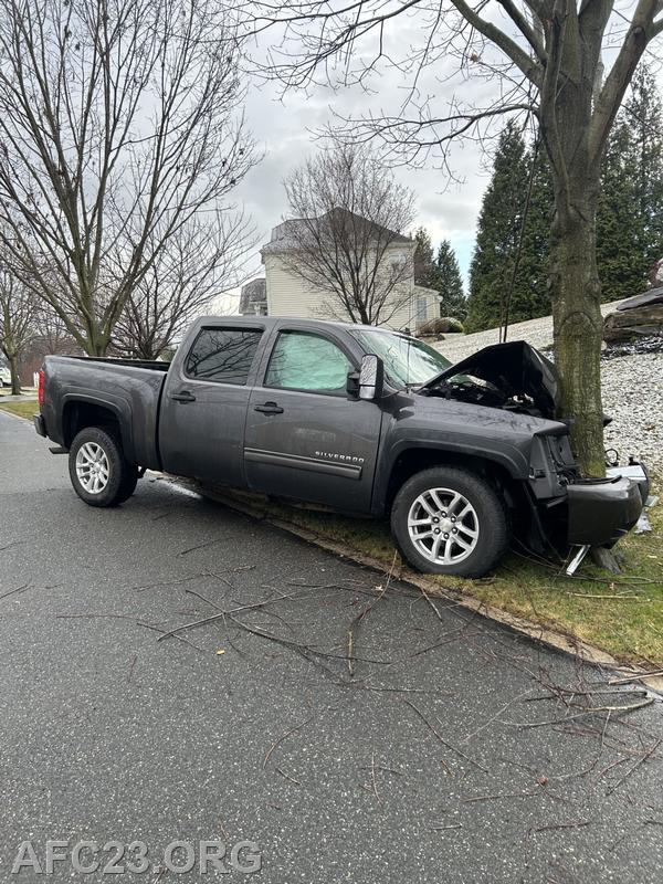 Ambulance, Chief, and Squad 23 responded following dispatch. Upon arrival, crews found a pick-up against a tree and the operator regaining consciousness. Chief 23 established command while EMS provided treatment and transported the patient to a nearby hospital.