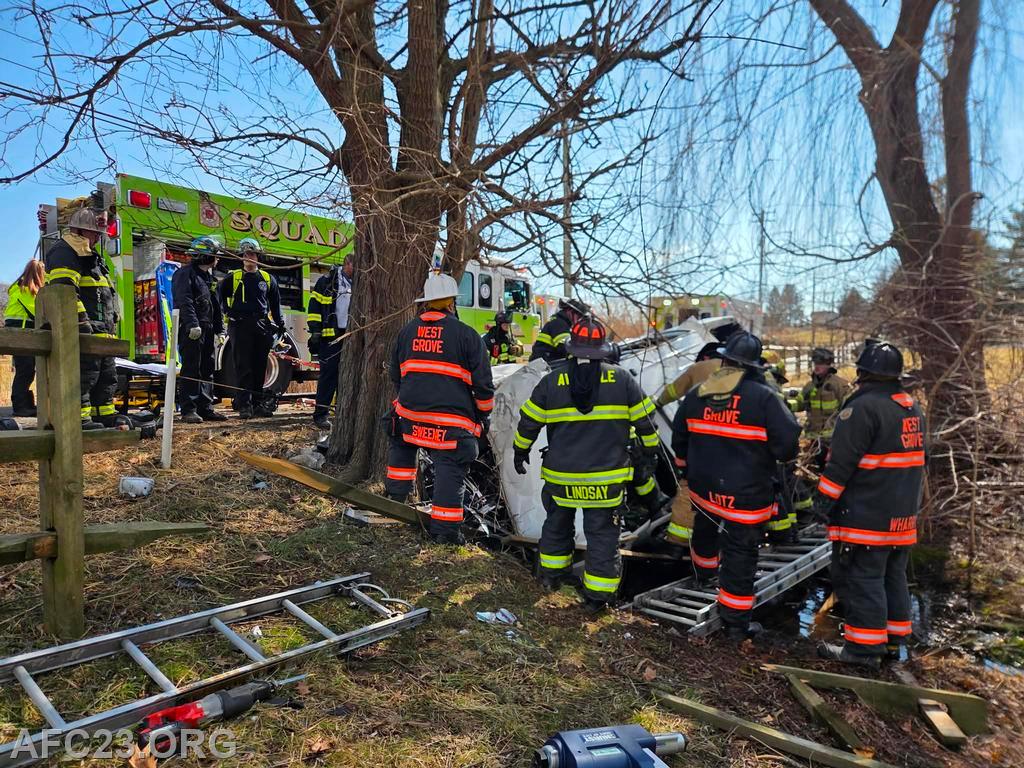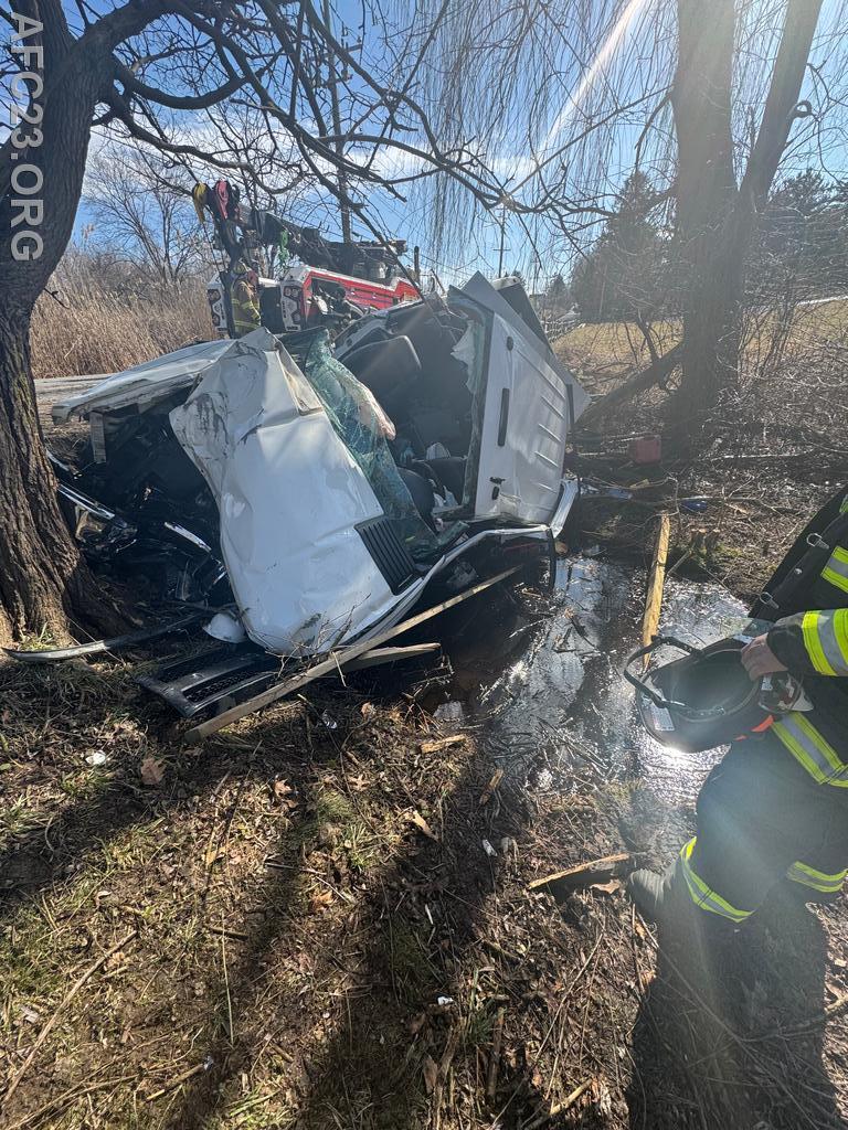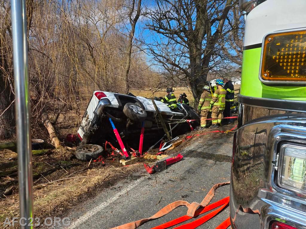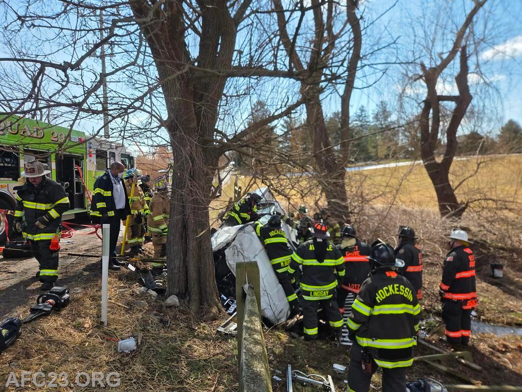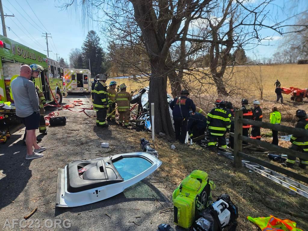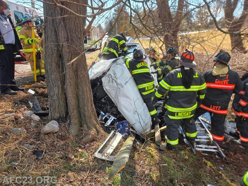 Deputy 23 (B. Cole) arrived first finding a vehicle into a tree in a small creek and confirmed entrapment. Chief 23 (S. Cole) arrived and established the Newark Road Command. Squad 23 arrived and began stabilizing the vehicle with their Rescue 42 struts. Due to the vehicle's position and being extremely unstable, Command requested Blittersdorf’s Towing to the scene to assist in vehicle stabilization. Squad 23, along with mutual aid, began extricating the patient from the driver seat. Units prepared to remove the doors and roof of the vehicle. Engine 22-1 self-attached to the incident, and arrived to provide additional rescue equipment and manpower. Extrication was complete within 20 minutes of the arrival of Squad 23.